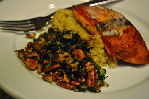 This is the best left-overs meal I think I've ever made! I was trying to use up some stuff in the fridge and based the recipe on this Caramelized Brussels Sprouts recipe (which I thought was a little too sweet, by the way).